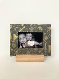 picture frames were the very first designs i made and sold after art school and this frame was conceived in 2003. it's design features a glass cover, tabs in the back for tucking the photo under and a wood block to hold the frame. i make these in many different patterns and it has been a customer favorite for 2 decades now! this is a standing frame and can be positioned horizontally or vertically (if the pattern allows)